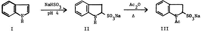 The subsequent acetylation also proved to be an unexpected problem. The literature procedure4 used the crude, wet product without purification and there was no spectral or analytical data about the exact nature of the compound. We have isolated the dry sodium 1-acetylindoline-2-sulfonate (III), as a white solid which has displayed an infrared band showing the presence of water even after drying in vacuo at 110°C; the elemental analysis confirmed it as a hemihydrate. Here again, a brief study of the reaction parameters and changes made based on the information obtained resulted in an 85% yield of III; larger scale runs averaged between 82-85%. These results have meant correspondingly higher yields of the 5-substituted indoles shown in Scheme 2.
