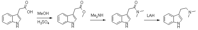 That's why I looked into alternative methods, and re-found the old route by Fish (JACS in the 50's, sorry, I haven't my notes here) starting from indoleacetic acid (IAA). According to my still unconfirmed information IAA is used in agriculture/horticulture as a plant grow hormone, which would make it an affordable and obtainable precursor. [Note: The actual reagent is IAA methyl ester, not the free acid]