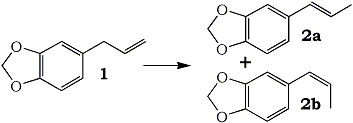 Isosafrole 2 (trans-2a and cis-2b) may be prepared from Safrole 1. This is the best way to afford the starting material of the synthesis of heliotropin. There are a lot of methods presented for realizing this isomerization. But almost they are very difficult to apply, because the require some hard conditions such as in high or low pressure or use some strange catalysts and, moreover reaction is run with solvents1-4. In previous paper we proposed to replace these above mentioned conditions by the new method in dry media condition, with or without phase transfer catalysts. With these conditions, we got some good results, but the reaction time was still long5.