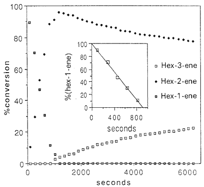 The same reaction was studied for hex-1-ene. Its concentration decreases linearly with time up to 90% conversion. At this point, the subsequent formation of hex-3-ene begins (Fig.). Since hex-2-ene is the only detectable product at the beginning of the reaction. and since its concentration decreases upon formation of hex-3-ene. we conclude that the migration of the C=C bond occurs stepwise. i.e. hex-1-ene → hex-2-ene → hex-3-ene.