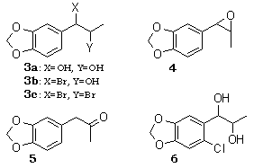 A mixture of Isosafrole (2) (100 mg, 0.62 mmol) and NaBr (192 mg, 1.9 mmol) dissolved in MeCN (7 mL) and H2O (3 mL) was electrolyzed in a beaker-type undivided cell (3 cm in diameter and 10 cm in height). A constant current (20 mA, 2.83 F/mol) was passed for 140 min by using platinum foils (2 x 1.5 cm2) as electrodes and a Metronix Model 543B DC power supply. After the electrolysis at room temperature, 0.5 mL of 1% aqueous H2SO4 was added to the mixture, which was stirred for 1 h and neutralized with aqueous NaHCO3. After evaporation of solvents under reduced pressure, the organic substances were extracted with ethyl acetate. The extracts were washed with brine, dried (Na2SO4), and concentrated in vacuo to give a colorless oil, which was chromatographed (Mallinckrodt Silica CC-7 Special), affording Isosafrole Glycol (3a) (116 mg, 98%) as colorless crystals8 whose spectral data were identical with those reported. In an another experiment, after the electrolysis as mentioned above, the mixture was concentrated in vacuo and the organic substances were extracted with ethyl acetate. The usual workup and chromatography provided Isosafrole Glycol (3a) (28 mg, 23%) and 4 (78 mg, 71 %). The structure of 4 was identified spectroscopically by comparison with IR and 1H NMR spectra of the authentic sample prepared by mCPBA oxidation of Isosafrole (2)9.