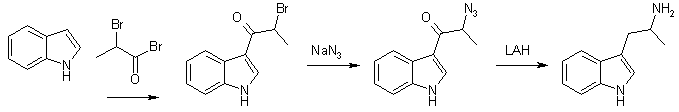 3-(2-Azidopropionyl)indole (3.5g) in dry THF (50 ml) was added to a well-stirred mixture of LAH (4.0g) in dry THF (100ml). After a reflux period (23h), the excess LAH was destroyed by addition of KOH (2M, 5ml). The mixture was filtered and the solid inorganic phase carefully washed with ether. The ether phase was dried and evaporated. The residue recrystallized from hexane/EtOAc gave 2.1g (74%), mp 100-102°C.