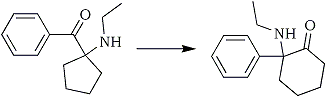 1-hydroxycyclopentyl-(o-chlorophenyl)-ketone N-methylimine (2.0 g) is dissolved in 15 ml of Decalin and refluxed for two and one-half hours. After evaporation of the Decalin under reduced pressure, the residue is extracted with dilute hydrochloric acid, the solution treated with decolorizing charcoal, and the resulting acidic solution is made basic. The liberated product, 2-methylamino- 2-(o-chlorophenyl)-cyclohexanone, after crystallization from pentane-ether, has mp 92-93°C. The hydrochloride of this compound has mp 262-263°C.