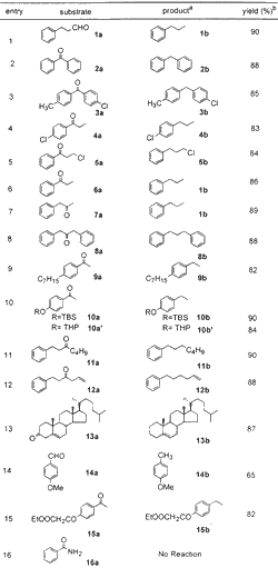 To establish the optimum reaction conditions, the reaction was first studied on readily available benzophenone 2a, which was reduced to diphenylmethane 2b in 88% isolated yield (entry 2) in 10 min. Another substrate, phenyl propanaldehyde 1a, was reduced to n-propyl benzene 1b in 90% yield (entry 1) in 8 min. These two examples demonstrate that not only benzylic ketone (a very easily reducible carbonyl) but also aliphatic aldehyde is suitable for the present protocol (Table 1). The halo-substituted aryl ketones 3a, 4a, and 5a also were reduced to the corresponding methylene compounds 3b, 4b, and 5b without affecting the aryl halide group (entries 3 and 4). The alkyl halide group (entry 5) is also unaffected under the present protocol. Aliphatic keto substrates 7a, 8a, 11a, 12a, and 13a were also well suited to the present reaction conditions (entries 7, 8, and 11-13). Substrates 10a and 10a' demonstrate the selective reduction of ketone in the presence of TBS and THP ethers (entry 10), and substrate 12a demonstrates inertness to olefin functionality (entry 12). The steroid substrate 13a was reduced without isomerization of double bond in 87% yield requiring only 10 min (entry 13). The reduction of anisaldehyde 14a to 4-methyl anisole 14b was also achieved, albeit in low yield (65%). In the case of compound 15a (entry 15), where both carbonyl and ester groups are present in the same substrate, selective reduction of carbonyl group to methylene is observed in 82% isolated yield. Attempts, however, to reduce benzamide 16a to benzylamine (entry 16) were futile.
