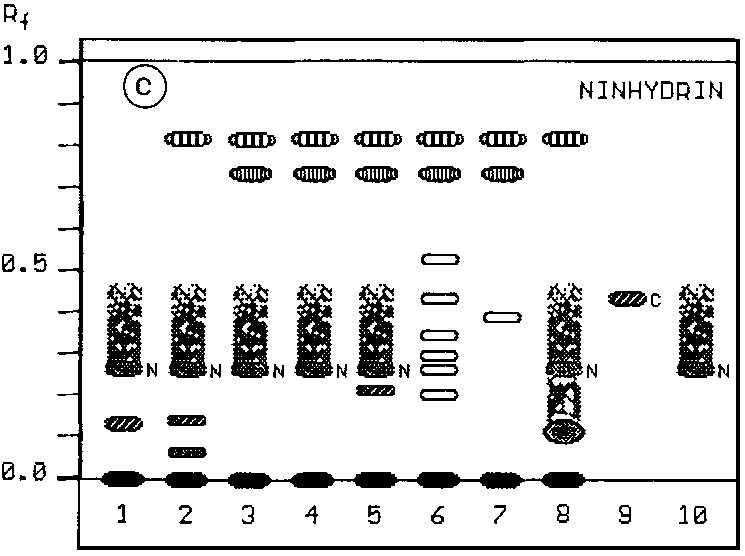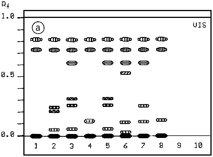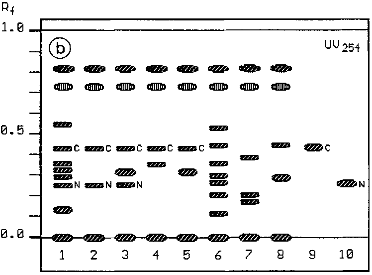 An extraction without partition and with MeOH only as solvent was chosen to get complex TLC patterns showing the khat sample zones of the typical khatamines and other constituents (Figs. 1a-c). Under visible light (Fig. 1a) khat samples show a brown-green zone of polar products (flavonoids) on the starting line and at Rf 0.06 a grey zone, at Rf 0.62 a light-yellow and at 0.72 a yellow zone, probably artifacts (decomposition products of the unstable cathinone) can be observed. At Rf 0.82 a green zone locates the colouring principle of the plant (chlorophyll).
