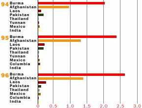 I. The World HarvestIllicit cultivation of the opium poppy, Papaver somniferum, has traditionally been an Asian enterprise. More recently, production has spread to the highlands of the tropical regions of the Western Hemisphere, primarily Mexico and Colombia. The worldwide illicit opium harvest in 1995 was estimated at 4,157 metric tons, the majority accounted for by the estimated 2,561 tons produced in Southeast Asia (primarily Myanmar (Burma), with a substantial harvest in Laos and smaller crops in Thailand, China, Vietnam, and Cambodia) (1). More recently Afghanistan has been the number one illicit producer of opium, with an estimated harvest of over 4,500 metric tons in 1999 with the South East Asian harvest declining to about half its mid-90s peak (11, 12). Colombia has held steady in the range of 60-70 tons per year (2), while Mexico's harvest has hovered in the 50 ton range since the mid-1990s. (3). Heroin originating from these Western Hemisphere sources is destined almost exclusively for the United States, while Southeast Asian product enjoys worldwide distribution. Heroin of Southwest Asian origin is mostly exported to Europe or consumed regionally, where there is a steadily rising addict (and overall) population (esp., Pakistan and India(12)).
