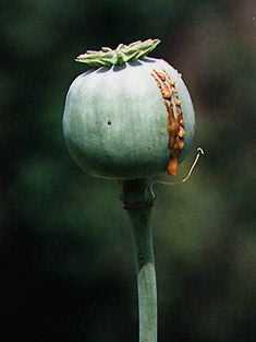 P. somniferum is an annual, flowering plant, believed to have evolved, through centuries of breeding and cultivation, from a wild-growing ancestor native to the northeastern Mediterranean coast (4). It grows best in dry, temperate climates, usually at altitudes of over 800 meters (2500 ft) above sea-level. The optimal growing season is from September to July depending on the regional climate. In Southeast Asia, planting is completed by late October, in order to take advantage of the long days of the Southern Hemisphere winter. Growing plots are selected for maximum sun exposure on slopes of gradients of 20 to 40 degrees for optimal drainage. (Excessive moisture is damaging to the plant). About one pound of seed is needed to sow one acre of land. By November, when the young plant enters the "cabbage" or "lettuce" stage and has reached a height of about one foot, some of the plants are removed in order to leave room for the others to grow (about 1 to 2 feet between plants). A typical opium poppy field has 60,000 to 120,000 plants per hectare (2.46 acres) (5). The mature plant reaches a height of about 2-5 feet by late winter, beginning to flower after about 90 days of growth, 3 to 8 flowers per plant. Flowering continues for several weeks, reaching full bloom by early spring (or later, depending on the region; later development is typical in more western regions (4)). After full bloom, the petals drop to reveal a small, round grayish-green fruit which continues to develop into an oblate, elongated or globular capsule (also called the seedpod, bulb or poppy head) about the size of a chicken egg. The skin of the pod encloses the ovary, the walls of which secrete the latex (opium) which collects in a network of vessels and tubes throughout the pod.