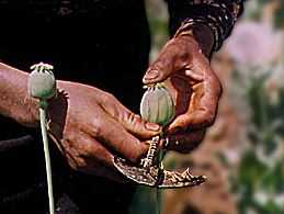 About two weeks after the petals have fallen, the pods are fully mature, as indicated by the aforementioned shape of the capsule, a change in color from grayish-green to dark green; the points of the pods crown now stand straight out or are curved upward. At this point the pods are ready to be scored (or tapped, incised or lanced). Harvesters make the incision with a a three- or four- bladed instrument (iron or glass blades bound tightly on a wooden handle), designed to make an incision of about one millimeter deep. (Too deep an incision may result in excessive spilling either into the center of the pod or to the ground; too shallow and the latex will not ooze as desired). The pods are scored two to three times each in the afternoon, causing the white latex to drip onto the surface of the pod. The opium oxidizes, darkens, and thickens overnight, and in the morning is scraped from the surface with a flat iron blade. This process is repeated over several days until each pod is depleted of its opium. Each pod may yield from 10 to 100 milligrams of opium, with an average of 80 milligrams, which is set aside in a container to dry in the sun. (Pods giving highest yields are marked, cut from the plant, cut open and dried in the sun, their seeds saved for the next planting). Dried, raw opium is brown to black in color; higher-quality product is brown and sticky. A typical farm will produce 3 to 9 kilograms of opium per acre (5).