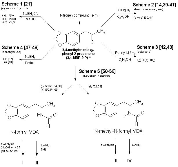Based on synthesis considerations, Schemes 1-4 are the most likely to be used in clandestine laboratories. Schemes 5-9 are more time-consuming. require greater laboratory skills, generally result in poorer yields, and thus are less likely to be used.