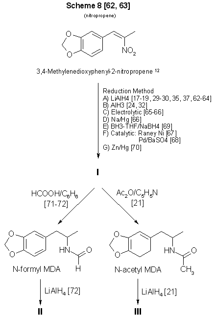 A substantial amount of literature has been devoted to the synthesis and reduction of nitroalkenes17-19,24,29,30,32,35,37,62-70 (Scheme 8, Fig. 3, and Scheme 10, Fig. 5). The compound 1-(3,4-methylenedioxyphenyl)-2-nitropropene (beta-nitroisosafrole) commercially available and easily synthesized62,63. However. preparation of N-substituted analogs requires that the reduction product, MDA, be further processed21,71,72. it is unlikely that the clandestine chemist would continue to manipulate chemically a controlled substance to produce an analog of similar monetary value and marketability. If the appropriate piperonals are available to react with nitroethane, the Knoevenagel-Walter condensation, will permit the synthesis of ring-substituted analogs24,29 through nitropropene intermediates (Fig. 5).