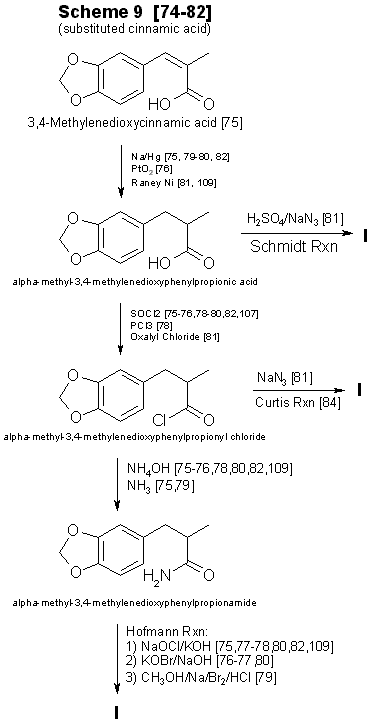 Currently, alpha-methyl-3,4-methylenedioxycinnamic acid (Scheme 9, Fig. 4) and its ring substituted derivatives are not commercially available73. Synthesis74-82 of the substituted cinnamic acid precursors requires several steps having various modifications79,80,83,84, in addition to the reaction sequence necessary for preparation of MDA or its analogs75,78,82. This technique requires substantial laboratory skills, and the concomitant low yields imply that his method will infrequently be encountered.