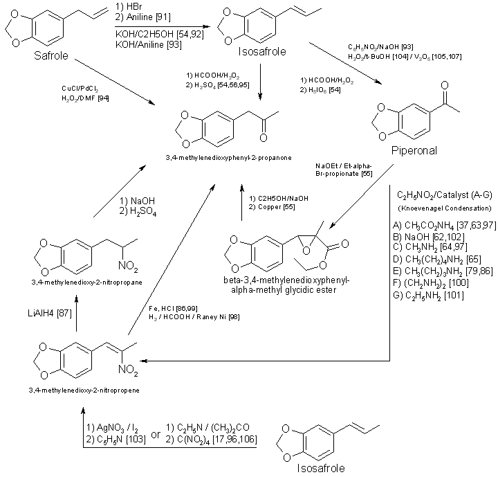 The remaining topic is availability of precursors. As noted in prior sections of this paper, the literature citations provided here and in Table 5 are listed to illustrate general reaction types or variations in reactants and catalysts and do not necessarily delineate a synthesis which is specific for a methylenedioxy compound. This will provide the forensic science chemist with the widest possible acquaintance with potential clandestine laboratory synthesis modifications. Table 3 includes alternative names for some precursors and related compounds. The relationship between the five most often used precursors, safrole, isosafrole, piperonylacetone (that is, 3,4-MDP-2-P), piperonal, and beta-nitroisosafrole, is illustrated in Fig. 517,37,54-56,62-65,79,86,87,91-105,107,108. All five compounds are commercially available73. The first two are usually encountered as the starting materials in preparation of piperonylacetone, whereas piperonal generally serves as the primary precursor for beta-nitroisosafrole. Safrole, isosafrole, and piperonal may themselves be prepared in good to excellent yields from 1,2-methylenedioxybenzene through the 4-bromo intermediate106. Substitution of 1,4-benzodioxane as the starting material in that reaction should produce ethylenedioxy precursors.