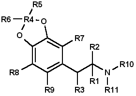 Table 1 presents many of the possible substitution patterns for MDA. Throughout this discussion 3,4-MDA will be considered the parent, or reference, compound (R1 = CH3, R4 = CH2, R2, R3, R5 to R11 = H), upon which the indicated modification is effected. When nonbridged phenylisopropylamines such as ephedrine, DOM, phentermine, or cathinone are being described, it should be recognized that the 3 and 4 ring positions in Table 1 are occupied by hydrogen or, as appropriate, the substituents shown for R7, R8, and R9.