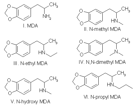 | MDA | 3,4-Methylenedioxyamphetamine; the love drug; 3,4-Methylenedioxyphenylisopropylamine |