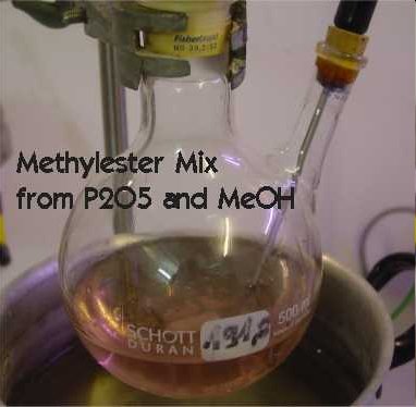 In a 500 ml two-neck RB flask a thermometer, a stirring bar and 3 mol MeOH (96 grams, not ml!) are inserted. The flask is put with ice-water to cool down the MeOH to about 5°C. In the meantime a first batch of 40g P2O5 is weighted and immediatly put in a tightly closed wide-mouth jar4.
