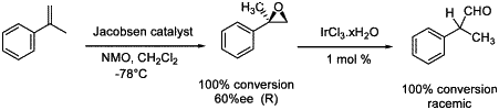 The optically active -arylpropanoic acid derivatives are effective nonsteroidal analgesics9 and synthetic routes to the corresponding enantiopure aldehydes are thus of high interest. As 2-arylpropanal was easily prepared by a Meinwald rearrangement (Table 1, entry 2) we focused on the chiral version. We first prepared the (R)-α-methylstyrene oxide in 60% ee with Jacobsen catalyst10 at -78°C. The rearrangement of this epoxide, was carried out with iridium trichloride in THF at 50°C but almost racemic aldehyde was obtained (Scheme 2). When the epoxide bears on the same carbon atom a methyl and a bulkier group, such as phenyl or adamantly, distinct migratory aptitudes of the two hydrogen atoms have been observed by Yamamoto et al. with monodeuteriated epoxides3. Nevertheless, the use of a bulky and chiral Lewis acid, or of a chiral iridium catalyst, may lead to a stereoselective control for this reaction.