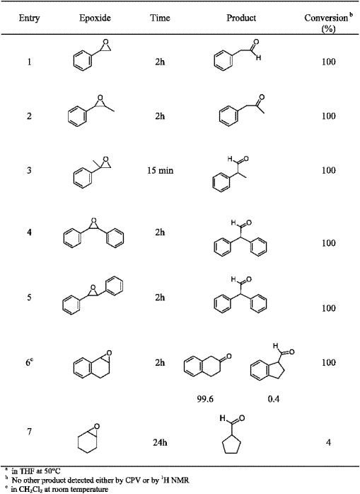 Iridium trichloride was used in 1% molar ratio relative to the epoxide (THF, 50°C; Table 1). Rearrangement of styrene oxide gave pure phenylacetaldehyde (entry 1). trans-β-Methylstyrene oxide and α-methylstyrene oxide (entries 2–3) rearranged selectively and quantitatively into phenylacetone and 2-arylpropanal, respectively. For trans and cis-stilbene (entries 4–5), diphenylacetaldehyde was the only formed product. In this later case, iridium lead to the aldehyde, while Pd(OAc)2, combined to PPh3, gave7a the ketone, deoxybenzoin. The only case in which IrCl3·xH2O lead to some traces of a secondary product was the reaction with dihydronaphtalene oxide (entry 6). Only 4% of cyclohexene oxide rearranges into cyclopentane carboxaldehyde (entry 7). Several tests were realized in order to improve this result by increasing the temperature to 100°C in toluene or DMF, without success. It was reported that LiBr–HMPA allowed more than 90% yield of cyclopentane carboxaldehyde in benzene at 80°C.5a