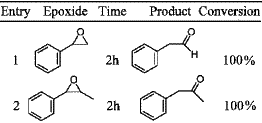 The epoxide (40 µL, 0.335 mmol for styrene epoxide) was added to a solution of IrCl3·xH2O (1 mg, 3.35×10-3 mmol) in THF (1 mL) and the reaction mixture stirred at room temperature. The reaction time was determined by GC analysis. After 2 h at 50°C, the solvent was removed and phenylacetaldehyde was recovered. Its purity (>99%) was determined by GC, 13C and 1H NMR. Conversions and ee values were determined by GC on a chiral column (β-dex-225 column, 30 m). All the final products were isolated in almost quantitative yields and characterized by comparison of their 13C and 1H NMR spectra with already reported data.