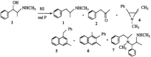 Methamphetamine 1 is a widely abused and highly addictive stimulant drug. The illicit synthesis of this compound has been achieved most commonly by the reductive amination of phenyl-2-propanone 2, by the Leuckart formamidation of 2 followed by hydrolysis or by the reduction of ephedrine or pseudoephedrine 3 with hydriodic acid and red phosphorus. This latter method is currently the most common encountered in clandestine laboratories in Victoria3. In this investigation, we have studied the structures of the impurities generated along with methamphetamine using this route from pseudoephedrine.