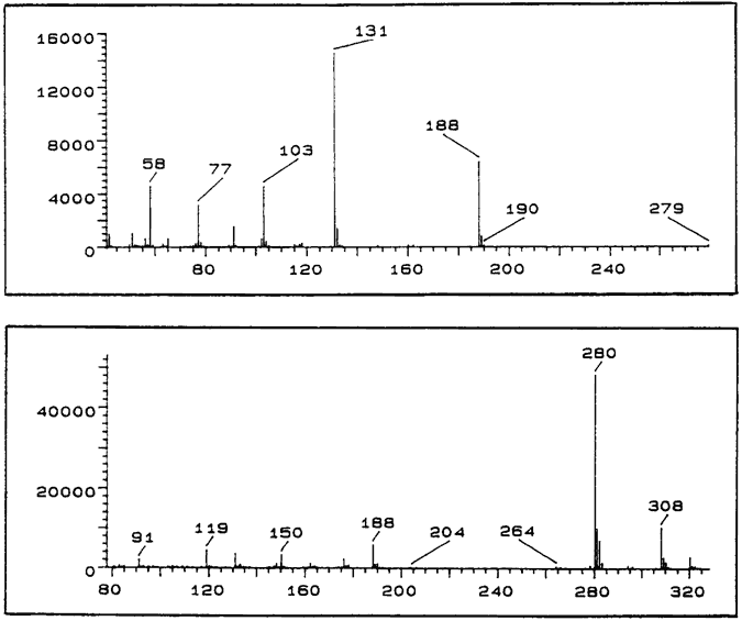 EI-MS m/z: 279 (2%), 188 (37%), 131 (100%), 103 (34%), 91 (11%), 77 (23%), 58 (20%).