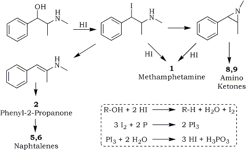 A possible reaction sequence for the reduction of ephedrine by hydriodic acid.
