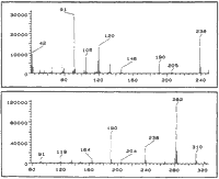 The EI and CI mass spectra of compound 8 are shown in Fig. 3. The spectra for 9 were almost identical, with only very minor variations in the relative peak intensities. These two compounds are isomeric with a molecular mass of 281 from the M+1 ion in the CI spectra at m/z 282. The highest mass peak in the EI spectra occurred at m/z 238. The loss of 43 eu to give this ion was also prominent in the CI spectrum. An acetyl (CH3C=O+) fragment could account for this loss, The presence of a carbonyl group in these molecules was confirmed by the presence of a peak at 1705 cm-1 in the IR spectra.
