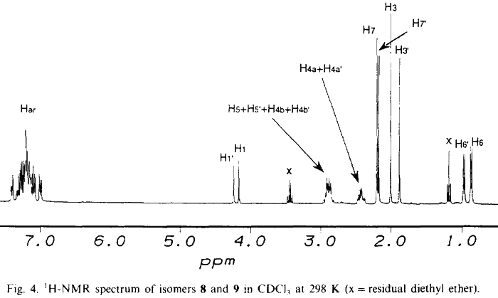 The initial 13C-NMR data indicated that each isomer contained carbonyl functionality, two monosubstituted aromatic rings (evident from 1H-NMR integrals), three methyl groups, two methyne groups and one methylene group. Apart from the deuterated chloroform NMR solvent, there was also a small amount of diethyl ether present (approximately 3.2% w/w) that had been used as a solvent in purification steps. DQF COSY data (Fig. 6) allowed the backbone of the isomeric species to be traced from H6 to H5 to H4a and H4b, respectively. The inequivalence of each proton bound to C4 was highlighted by the HETCOR spectrum (Fig. 7a). The HETCOR spectrum is comprised of a 13C decoupled NMR spectrum along the X-axis and a 1H-NMR spectrum along the Y-axis. Cross peaks indicate correlations between any 13C nucleus and 1H nucleus that are directly connected to each other, ie. where 1JCH coupling results.