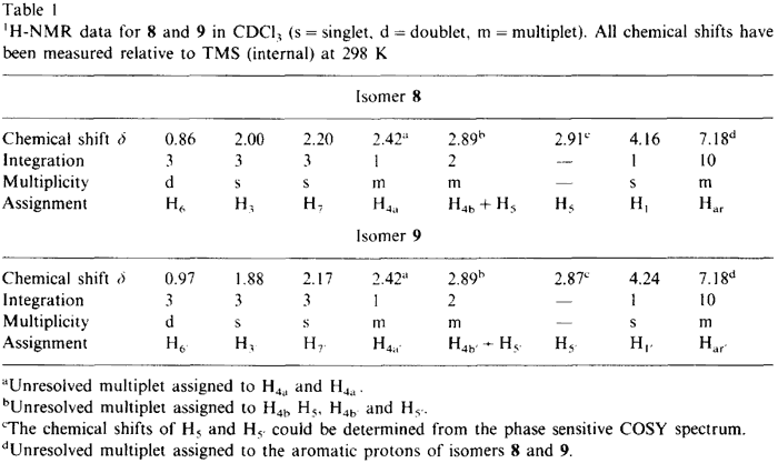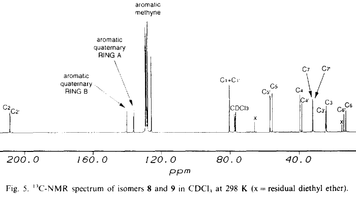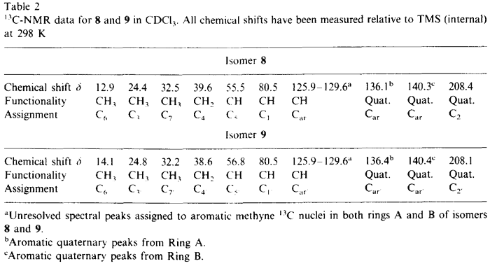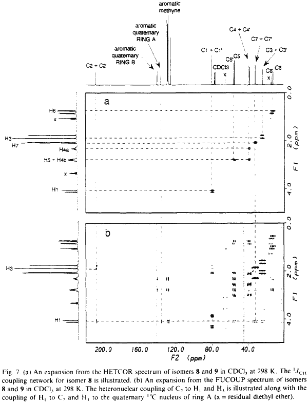 Further analyses involved the application of a FUCOUP experiment (Fig. 7b). This two dimensional heteronuclear experiment yielded similar information to the HETCOR experiment, however, correlations for a larger variety of CH coupling became evident. This data allowed specific NMR assignments to be determined for almost all 13C and 1H nuclei (this included the specific assignment of all of the quaternary 13C nuclei without any assumptions based on chemical shift data of model compounds). The aromatic methyne peaks could not be specifically assigned chemical shifts due to a lack of spectral resolution. The resultant data was sufficient to determine the general structure of isomers 8 and 9.