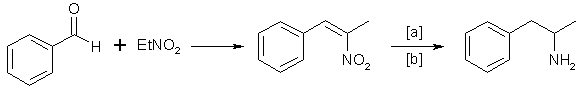 Condensation of benzaldehyde with nitroethane yields 1-phenyl-2-nitropropene2,9. Hydrogenation of the double bond and subsequent reduction of the nitro group gives the amphetamine: