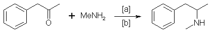 Illicit methamphetamine is primarly produced in the U.S.8 by reductive amination, according to the following scheme: