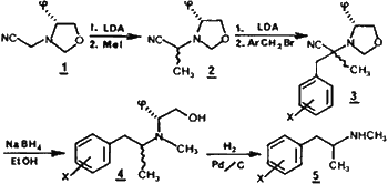 (S)-N-methyl-α-methyl-phenethylamines 5a-d were obtained in 56-62% e.e. from the chiral synthon (-)-N-cyanomethyl-4-phenyl-1,3-oxazolidine-1.