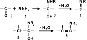 Primary (1) and secondary amines can condense with aldehydes and ketones (2) to give different kinds of products. Primary amines give imines (4). The reaction as shown in Fig. 1 is straightforward and proceeds through N-substituted hemiaminals (3) in high yields2.
