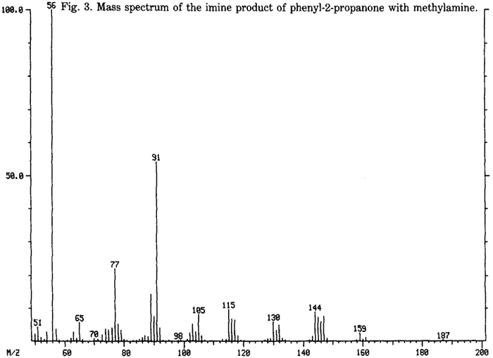 For example, methamphetamine was synthesized by reductive alkylation of phenyl-2-propanone and methylamine in the presence of hydrogen and palladium on carbon. Mixing of an equal volume (mole ratio 1:1.7) of P2P (7) and 40% methylamine in methanol immediately produced the imine (8) shown in Fig. 2. After 24 h, methamphetamine (9) is the main component (50%). The mass spectrum of the imine compound, 1-phenyl-2-methyl-2-(methylimino)-propane, is shown in Fig. 3. The imine compound is fairly stable since it does not readily reduce under the reaction conditions (50 lb hydrogen, Pd/C).