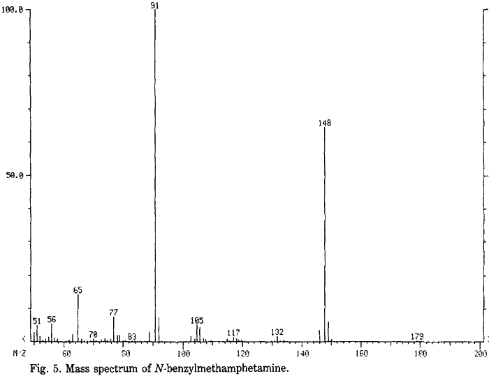 The reductive alkylation of phenyl-2-propanone and N-benzylmethylamine surprisingly gives methamphetamine as the final product rather than N-benzylmethamphetamine. Unlike the immediate formation of the imine compound in the reaction of P2P and methylamine, the analogous enamine is not seen by either GC or GC/MS during the reaction. Initially N-benzylmethamphetamine is detected along with the precursors P2P and N-benzylmethylamine. As the reaction progresses, toluene and methamphetamine are detected simultaneously. The concentrations of toluene and methamphetamine increase while the concentration of N-benzylmethamphetamine remains relatively constant. As expected, increasing the ratio of N-benzylmethylamine to P2P speeds up the reaction. Using twice the amount (mole ratio 2:1) of N-benzylmethylamine to P2P, the reaction is complete in 24 h. Fig. 4 shows the ion chromatogram of this reaction at 24 h with all five components of the reaction detected. Small amounts of P2P (Scan 955) and N-benzylmethamphetamine (scan 1569) remain as well as toluene (scan 390), N-benzylmethylamine (scan 866) and methamphetamine (scan 1016). The mass spectrum of N-benzylmethamphetamine is shown in Fig. 5.