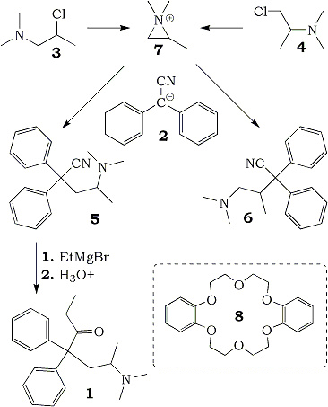 Methadone (1)1 was first synthesized as the racemic modification by Bockmuhl and Erhardt2 according to the approach outlined in Scheme 1. Treatment of diphenylacetonitrile anion (2) (as the lithium, sodium or potassium salt) with either 1-dimethylamino-2-chloropropane (3) or 2-dimethylamino-1-chloropropane (4) produced a mixture of isomeric nitriles 5 and 6. This reaction is extensively documented in the literature2-19. The aziridinium ion intermediate (7) has been proposed to account for the production of rearranged products (5 and 6) and for the stereochemical course17 in the key alkylation step. Reaction of 5 with ethyl magnesium bromide followed by acid hydrolysis afforded methadone (1) in high yield.