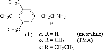 This latter amphetamine has been synthesized from myristicin in vitro, by a three-step process. trans-Isomyristicin, obtained from myristicin by heating in alcoholic potassium hydroxide, is converted by means of tetranitromethane to ß-nitro isomyristicin. Reduction of this nitropropene with LiAlH4 led smoothly to MMDA, which was isolated as the hydrochloride. Examination of MMDA in mice and dogs displayed a behavioural and toxicological pattern similar to that of TMA, both quantitatively and qualitatively. Preliminary human evaluation revealed initial intoxication at about 1.0 mg/kg (as free base). More extensive assay has confirmed a thoroughly effective hypnogogic dementia at less than 2.0 mg/kg. The psychotomimetic syndrome was complete at this level: increased dosages (to 3.2 mg/kg) merely prolonged the duration of the episode. Thus the potency of MMDA is somewhat greater than TMA and nearly three times greater than mescaline.