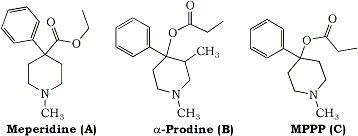 About a year after this incident, the entrepreneurs apparently decided to try their luck again, this time with a different drug. Their target product, 4-propyloxy-4-phenyl-N-methylpiperidine (MPPP), is structurally related to meperidine and alpha prodine (Fig. 1), both of which are controlled substances. Like meperidine, MPPP has pharmacologic activity as an analgesic, but, because of the slight modification in structure, was not illegal. The partners obtained the required supplies, rented a house in a different area of the county, and set up their operation. As luck would have it, the packing slip, which contained a list of the chemicals ordered as well as the purchaser’s identity, was found, accidentally, by a chemist who thought it was odd that a law firm should need such supplies. He notified the authorities who shared his suspicions, but were unable to obtain a search warrant for lack of probable cause. However, some investigation seemed in order, and, since the chemicals did constitute a fire hazard, the fire department was asked to inspect the premises. When they did so, they were accompanied by an undercover officer. The lab operator allowed the inspection, claiming that he was engaged in developing skin moisturizers and snow cone flavorings. Unfortunately, aside from warning the lab about the fire hazard and requiring proper disposal of the chemicals, no action could be taken. However, during the inspection, the undercover officer spotted some powder and surreptitiously (read: illegally) managed to obtain a small sample of it. This material, along with the packing slip, was submitted to the Santa Clara County Laboratory of Criminalistics where chemical analysis of the powder ruled out the presence of controlled substances. Criminalist James Norris examined the packing slip and concluded that the chemicals were probably being used to synthesize fentanyl analogs, although the list was not a perfect fit to the most common synthetic path. This conclusion was strengthened by the fact that the earlier incident had, by this time, been linked to the same two individuals.