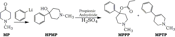 The authors had conducted an impressively thorough investigation during which it was discovered that MPPP had been chosen because it was a more potent analgesic than meperidine and because it could be easily synthesized from unrestricted chemicals. The starting material was N-methyl-4-piperidone (MP), which was converted to 4-hydroxy-4-phenyl-N-methylpiperidine (HPMP) by phenyl lithium. The intermediate was then reacted with propionic anhydride to produce the ester and desired product, MPPP. Although the earlier batches had been successful, when the subject modified the procedure, the new reaction conditions resulted in dehydration of HPMP and MPPP to the undesirable side product, N-methyl-4-phenyl-1,2,3,6-tetrahydropyridine (MPTP) (Fig. 2). The authors hypothesized that it was the use of these sloppy batches containing a mixture of HPMP, MPPP, and MPTP that probably caused the parkinsonism4.
