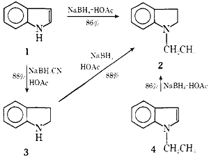 Quite unexpectedly, the reaction of indole (1) with NaBH4 in glacial HOAc gives N-ethylindoline (2) in 86% yield. Likewise, the reactions of indoline (3) and N-ethylindole (4) with NaBH4-HOAc give 2 in high yield.