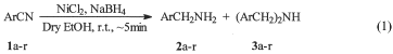 ExperimentalDry EtOH was prepared by the known procedure. NaBH4 (E. Merck) was used in all the reactions. NiCl26H2O (Qualigens) was used after drying in a nickel crucible in an oven at ~250°C until it turned golden yellow. It was powdered and stored in a vacuum desiccator. Nitriles 1a, 1b and 1r were obtained from commercial sources and were distilled before use. Nitriles 1c–q were prepared from their corresponding aldehydes by treatment with hydroxylamine hydrochloride according to the reported procedure.9 The IR spectra were recorded on a Perkin Elmer FT-IR spectrum 2000 and NMR spectra were recorded on Hitachi FT-NMR model R-600 (60 MHz) with TMS as the internal standard. Mass spectra were recorded on a Jeol JMS D 300 spectrometer using the electron impact method (70 eV). In a typical procedure, in a 100 ml conical flask mounted over a magnetic stirrer, fitted with reflux condenser and a mercury trap, was placed a mixture of nitrile (9.8 mmol), anhyd. nickel (II) chloride (9.8 mmol) and dry ethanol (20 ml). Sodium borohydride (29.4 mmol) was added very cautiously while stirring the solution vigorously. The progress of the reaction was monitored by TLC using benzene : ethyl acetate (90 : 10, v/v) as eluent. After the complete disappearance of the nitrile (~5 min), the reaction mixture was filtered through a celite pad after ~15 min. The filtered nickel boride precipitate was washed with ethanol (2×10 ml). The combined filtrate was diluted with water (150 ml) and extracted with ethyl acetate (3×10 ml). The combined extract was dried over anhyd. MgSO4, filtered and concentrated on a rotary vacuum evaporator. After drying under vacuum, the product was purified by column chromatogaphy over silica gel (20×2 cm; 100–200 mesh) using benzene : ethyl acetate as the eluent. Eluate was concentrated under reduced pressure to afford the products which were analysed by IR, NMR and mass spectra as most of these are known products [10a-b]. References [1] The work was presented at Annual Convention of Chemists. Haridwar, India, Nov. 2000, Handbook, pp. C4.