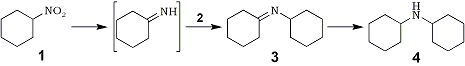 However mixtures of Ni2B with NaBH4 in CH3OH rapidly reduced 1 to 2 in good yield, although the desired product was contaminated with variable amounts of dicyclohexylamine 4, depending on the quantity and preparation of catalyst. Compound 4 most likely arose from imine 3, generated in situ from 2 and transient amounts of cyclohexanone imine, a presumed reduction intermediate.