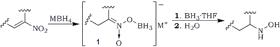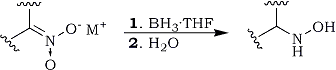 A number of reagents have been used to affect nitroalkene to nitroalkane transformations18. Generally there is loss of product due to dimerization caused by the addition of the nitronate intermediate to another molecule of nitroalkene (via a Michael addition). During our studies, we discovered that the reduction of α,β-unsaturated nitroalkenes by boranes produced high yields of hydroxylamines9; presumably formed via the nitronate intermediate, 1 (Eq 2).