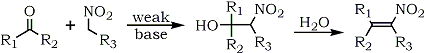 The classic route to nitroalkenes involves the base-catalyzed aldol condensation of nitroalkanes possessing, a hydrogen alpha to the carbonyl group in the aldehyde or ketone. This condensation is known as the Henry reaction33,34 and provides β-nitroalcohols which, upon dehydration, afford nitroalkenes (Eq. 1).