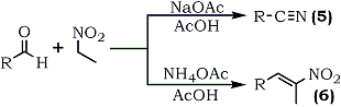 They note that the mere change of catalyst from ammonium acetate to sodium acetate, results in the formation of nitriles (5) instead of the expected β-methyl-β-nitrostyrenes (6) (Eq. 2).