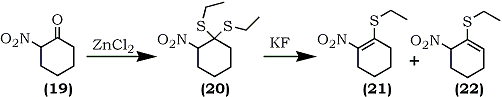 A general synthesis of 1-ethylthio-2-nitroalkenes has been described recently by Fuji and co-workers which is applicable to both cyclic and acyclic systems.69 For example, 2-nitrocyclohexanone (19) was converted into the S,S-acetal (20) by a reaction with ethanethiol catalyzed by zinc chloride or boron trifluoride etherate. Subsequent elimination of ethanethiol using potassium fluoride in refluxing 2-propanol afforded a mixture of isomeric compounds, 1-ethylthio-2-nitrocyclohexene (21) and 1-ethylthio-6-nitrocyclohexene (22) (Eq. 5). The isolated undesired product (22) (81%) can, in part, be isomerized to the desired olefin (21) by treatment with potassium fluoride in 2-propanol.