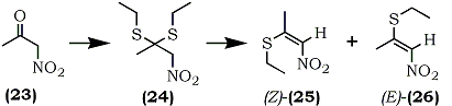 An analogous reaction sequence with nitroacetone (23) afforded the S,S-diethylacetal (24) which, gave two stereoisomeric 2-ethylthio-1-nitro-propenes, [(Z)-25] (56%) and [(E)-26] (39%) (Eq. 6).