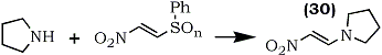 These new electron deficient olefins are good dienophiles in Diels-Alder reactions. For example, (27), (28) and (29) rapidly react with cyclopentadiene to give adducts in 75%, 97% and 82% yield respectively. Nitroalkene (29) is especially reactive due to activation by both the nitro and the sulfonyl groups. These olefins are also good Michael acceptors and they react with various nucleophiles. For example the reaction of (27), (28), and (29) with pyrrolidine gave the nitroenamine (30) in 81%, 89% and 71% yield respectively (Eq. 7).