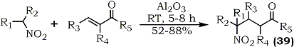 Recently, it has been disclosed that an excess of potassium fluoride and alumina dramatically increases the otherwise slow nitroaldol condensation78. 6-Nitropiperonal reportedly reacts with nitromethane in less than five minutes to give the corresponding dinitrostyrene in 80% yield after dehydration. In a separate study involving the case of α,β-unsaturated carbonyl compounds, conjugate addition of nitroalkanes occurs on the alumina surface in the absence of a solvent resulting in the preparation of 4-nitroketones and 4-nitro-aldehydes61 (39) (Eq. 10).