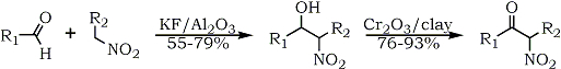 Recently, a preparation of α-nitroalcohols on potassium fluoride doped alumina was described62; the nitroalcohols were subsequently oxidized to nitroketones using montmorillonite supported chromium trioxide (Eq. 11). The procedure can be extended to aromatic aldehydes without dehydration of the nitroalcohols into nitroalkenes.