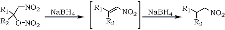 1-Nitro-2-alkyl nitrates, readily obtainable in high yields from 1-alkenes, have been converted to nitroalkanes by sodium borohydride reduction.81 The reaction presumably proceeds via the nitroalkene intermediate resulting from a base-induced nitric acid elimination (Eq. 12).
